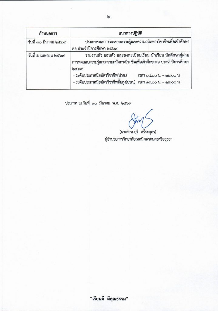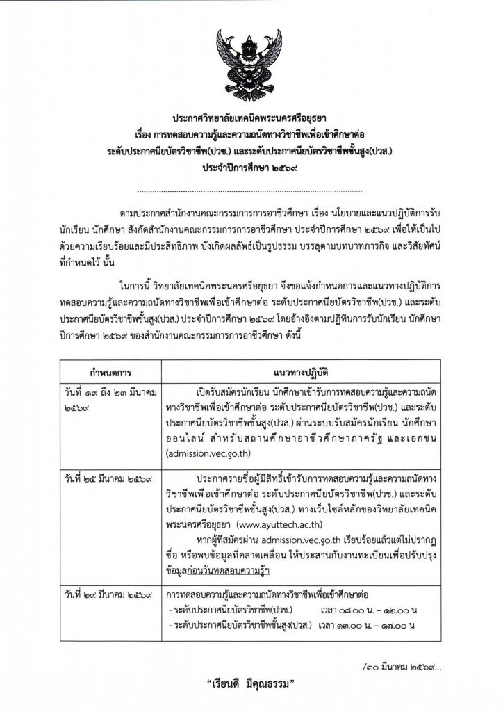 ในการนี้ วิทยาลัยเทคนิคพระนครศรีอยุธยา จึงขอแจ้งกำหนดการและแนวทางปฏิบัติการทดสอบความรู้และความถนัดทางวิชาชีพเพื่อเข้าศึกษาต่อ ระดับประกาศนียบัตรวิชาชีพ(ปวช.) และระดับประกาศนียบัตรวิชาชีพชั้นสูง(ปวส.) ประจำปีการศึกษา 2569 โดยอ้างอิงตามปฏิทินการรับนักเรียน นักศึกษา ปีการศึกษา 2569 ของสำนักงานคณะกรรมการการอาชีวศึกษา ดังนี้